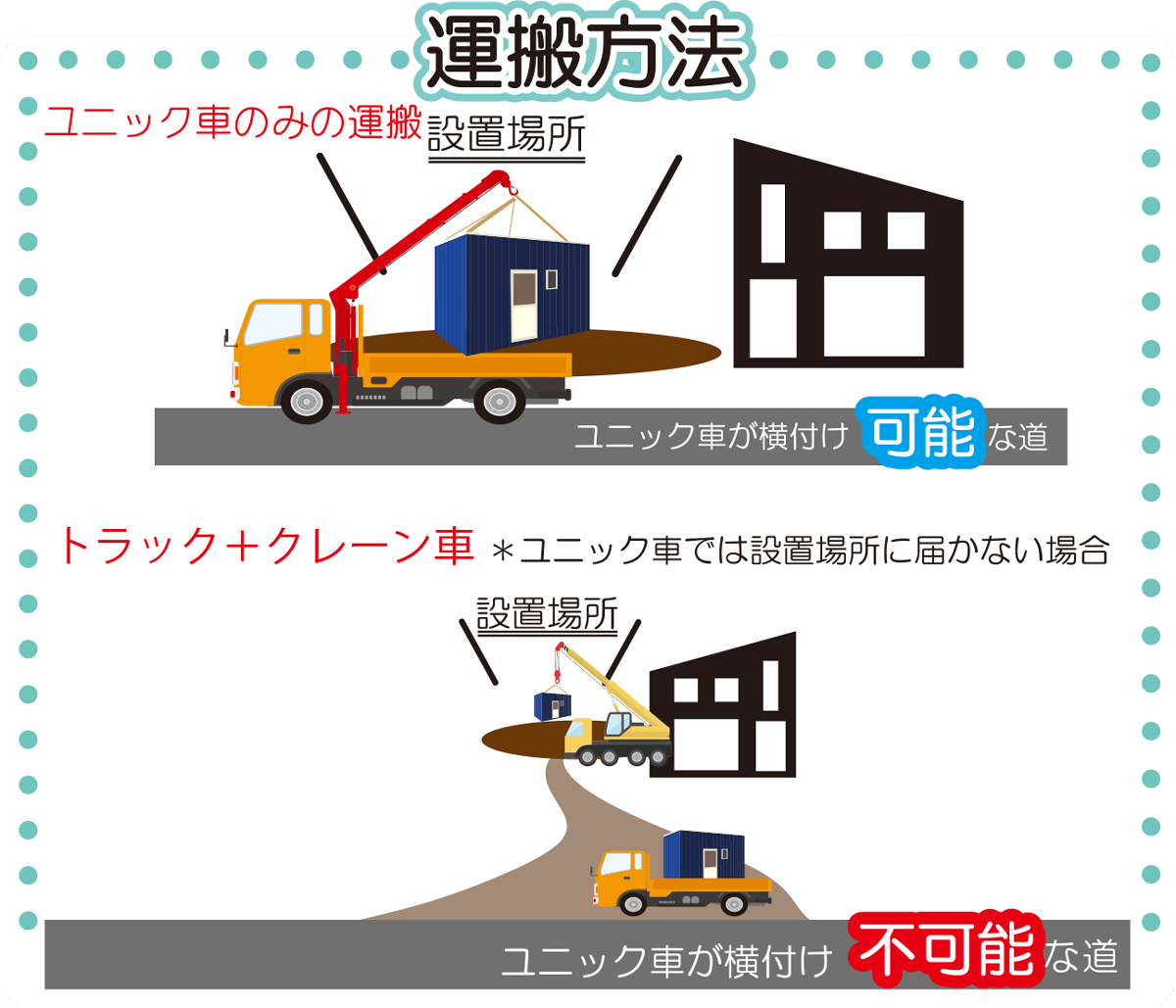 - 運搬設置が不可能な場合、別途見積にて現地での組立も可能です。